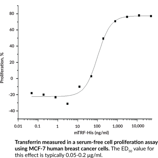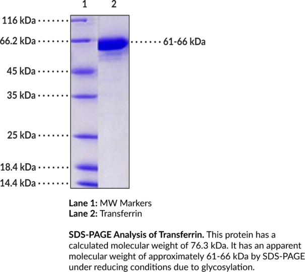 Transferrin is a glycoprotein that binds and transports ferric iron. It is a bilobal protein composed of N- and C-terminal lobes, each housing a ferric iron binding site, connected by a seven-amino acid bridge. Transferrin is predominately synthesized in hepatocytes, but is also expressed in Sertoli, ependymal, oligodendroglial, and metastatic melanoma cell lines, and is secreted into the circulation. Iron-containing transferrin binds to the transferrin receptor (TFR1, Cay-32031) on the surface of iron-requiring cells to form the transferrin/TFR complex which undergoes clathrin-dependent endocytosis to facilitate intracellular iron release. The transferrin/TFR complex is then returned to the cell surface and apo-transferrin is released back into the circulation via dissociation or displacement by an iron-containing transferrin. Immunodepletion of transferrin inhibits serum-induced ferroptosis of Bax and Bak double knockout mouse embryonic fibroblasts (MEFs), indicating that transferrin is a regulator of ferroptosis. Exogenous administration of apo-transferrin to three-day-old rats increases expression of myelin constituents and enhances myelinogenesis in myelin-deficient rats. It also normalizes labile plasma iron concentrations and red blood cell survival, increases hemoglobin production, and decreases reticulocytosis and splenomegaly in the Hbbth1/th1 mouse model of beta-thalassemia. Cayman's Transferrin (mouse, recombinant) protein can be used for cell-based assays. This protein consists of 689 amino acids, has a calculated molecular weight of 76.3 kDa, and a predicted N-terminus of Val20 after signal peptide cleavage. By SDS-PAGE, under reducing conditions, the apparent molecular mass of the protein is 61-66 kDa due to glycosylation.Synonyms: beta-1 Metal-binding Globulin, Serotransferrin, Siderophilin. Purity: >95% estimated by SDS-PAGE. Endotoxin Testing: <1.0 EU/µg, determined by the LAL endotoxin assay. Source: Recombinant mouse C-terminal His-tagged transferrin expressed in HEK293 cells. Amino Acids: 20-697. MW: 76.3 kDa. Formulation: (Request formulation change), Lyophilized from sterile PBS, pH 7.4. UniProt Accession #: Q921I1.
