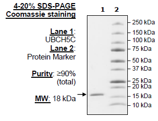 Human UbcH5c, also known as UBE2D3, (GenBank Accession No. NM_001300795), amino-acids 2-end, with N-terminal His tag, MW=18 kDa, expressed in an E. coli expression system.