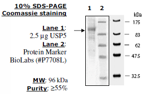 Human USP5 (Ubiquitin-Specific Protease 5) or Isopeptidase T (IsoT), GenBank Accession No. NM_001098536, amino-acids 2-858(end) with an N-terminal FLAG-tag, MW=96 kDa, expressed in a baculovirus-infected Sf9 cell expression system.