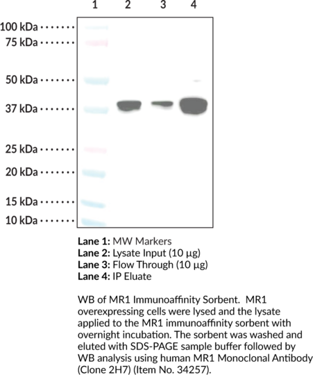 Major histocompatibility complex (MHC) class I-related gene protein (MR1) is a non-polymorphic MHC class Ib antigen-presenting cell surface molecule that is required for T cell receptor-mediated activation of mucosal-associated invariant T (MAIT) cells. It is composed of alpha1 and alpha2 domains, which form an antigen-binding pocket, and an alpha3 domain that interacts with beta2-microglobulin. MR1 mRNA is ubiquitously expressed and, following translation, MR1 protein is localized to the endoplasmic reticulum in a partially folded state. Upon binding of a riboflavin-derived microbial antigen, MR1 undergoes a conformational change and translocates to the cell surface where it induces MAIT cell activation via an interaction with the MAIT cell T cell receptor and activates various immunomodulatory effects, including cytokine release, initiation of adaptive immune responses, and promotion of tissue repair. Cayman's MR1 Immunoaffinity Sorbent is designed for immunoprecipitation (IP) of MR1 protein from biological samples. This is an effective way to concentrate MR1 protein for subsequent detection by a different MR1 antibody by immunoprecipitation (IP) (LC/MS certified) and Western blot (WB). The MR1 affinity sorbent consists of Cayman's MR1 Monoclonal Antibody (Clone 2H7) (Cay-34257) coupled to CNBr-activated Sepharose 4B.Synonyms: Class I Histocompatibility Antigen-like Protein, Major Histocompatibility Complex Class I-related Gene Protein, MHC Class I-related Gene Protein. Immunogen: Recombinant human MR1 (aa 22-292) protein. Clone Designation: 2H7. Formulation: 400 µl of CNBr-activated Sepharose 4B coupled to a human MR1 monoclonal antibody (Clone 2H7) (Item No. 34257). Storage Buffer: PBS, pH 7.2, with 0.02% sodium azide. Host: Mouse. Isotype: IgG1. Applications: IP, WB, LC-MS. Cross Reactivity: (+) MR1. UniProt Accession #: Q95460.